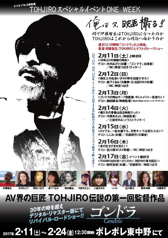 ドグマ総帥TOHJIROがAV監督になる以前、「伊藤智生」名義で監督した映画「ゴンドラ」が、完成から30年の時を経て、2017年1月28日より渋谷ユーロスペース、2月11日よりポレポレ東中野にてリバイバルロードショーが決定しました! その「ゴンドラ」リバイバ...