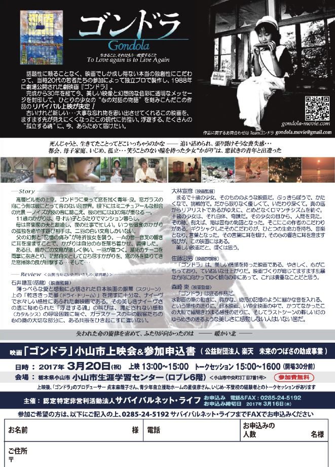 <上映会のお知らせ in 栃木県小山市> 上映日 平成29年3月20日(祝) 時 間 12:30開場/上映13:00~15:00 トークセッション 15:00~16:00 会 場 小山市生涯学習センター(ロブレ6階) 参加費 無料 主催・申し込み先 サバイバルネット・ラ... -